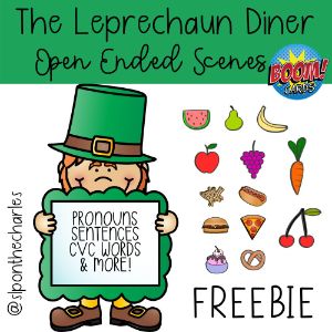This cute freebie will be great for my early intervention and preschool clients working on food vocabulary and the verb eat. It offers many opportunities to label foods and use the verb “eat” as you feed the leprechauns. I’m planning on having plastic food with me and feeding a puppet the foods that the leprechaun is eating. For little ones who are working on imitation of sound effects, this is a great activity to work on sounds like “yum,” “mmm,” “yummy,” “eeeuw,” and “yuck.”
