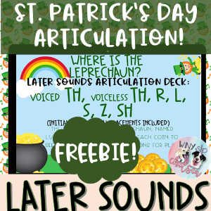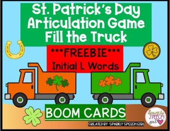 This freebie targets initial /l/ while filling a truck with St. Patrick’s Day theme pictures. You can also use it for working on final /k/ in a drill activity where the student has to say a structured sentence such as “in the truck” every time they fill the truck with a coin, clover or horseshoe.