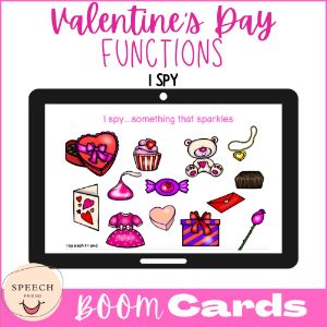 This free Boomcard is great for targeting valentine’s theme vocabulary (label the items on the card), answering questions about object function, and working on /sp/ during articulation therapy. If you’re working on adjectives, have your student say “I spy” and use a few adjectives to get you to figure out what the item is. It helps if you come up with a list of adjectives your student will use during the activity before you start.